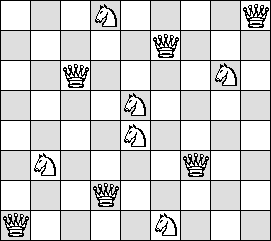 This month we investigate chess positions containing two types of pieces A and B subject to the condition: each A attacks exactly n B's (and no A's), and each B attacks exactly m A's (and no B's). Can you find smaller solutions? Can you solve one of the unsolved cases? What are the smallest solutions for other pairs of pieces?