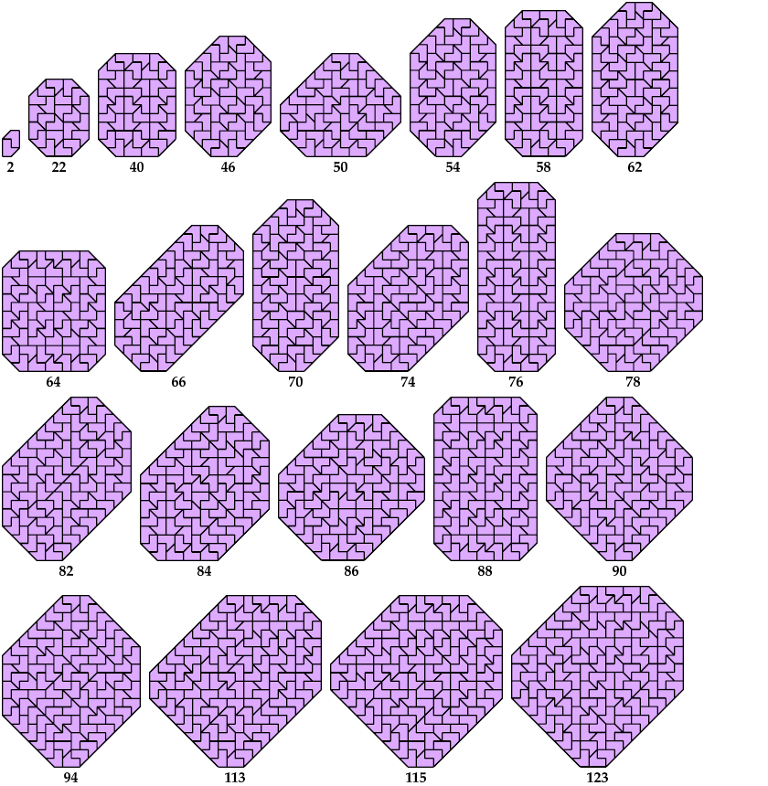 Joe DeVincentis found a shape whose spectrum consists of at least {4,8,18,24,38,54} ∪ {7,9,11, . . . } ∪ {32,36,40, . . . } and maybe more. George Sicherman found several of these tilings.